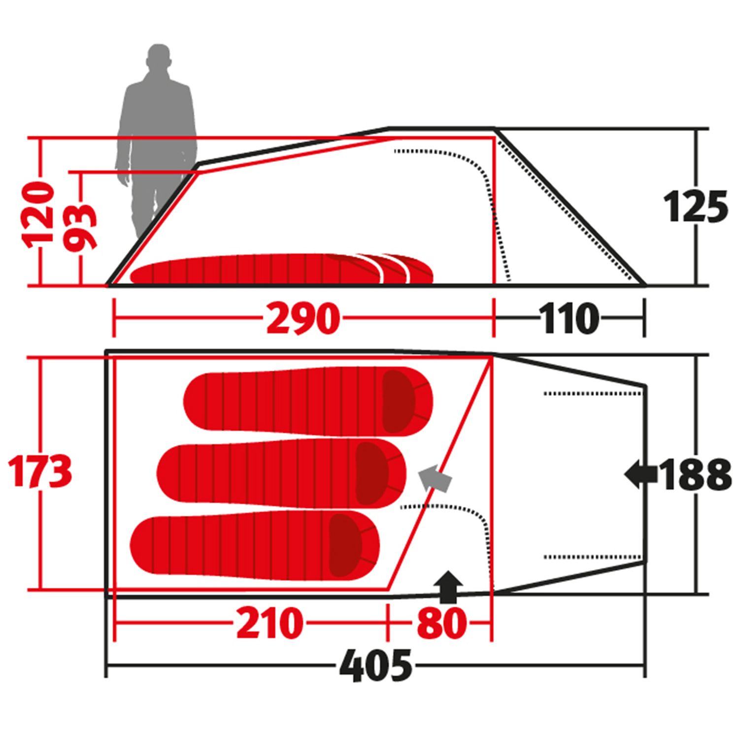 - Увеличенная длина и ширина спального места значительно превышает минимальные допустимые размеры принятых стандартов, что увеличивает полезную площадь палатки, делая ее достаточно просторной для двух человек. Данная палатка будет комфорта для людей с ростом более 2 метров, а также для двух взрослых и ребенка дошкольного возраста.