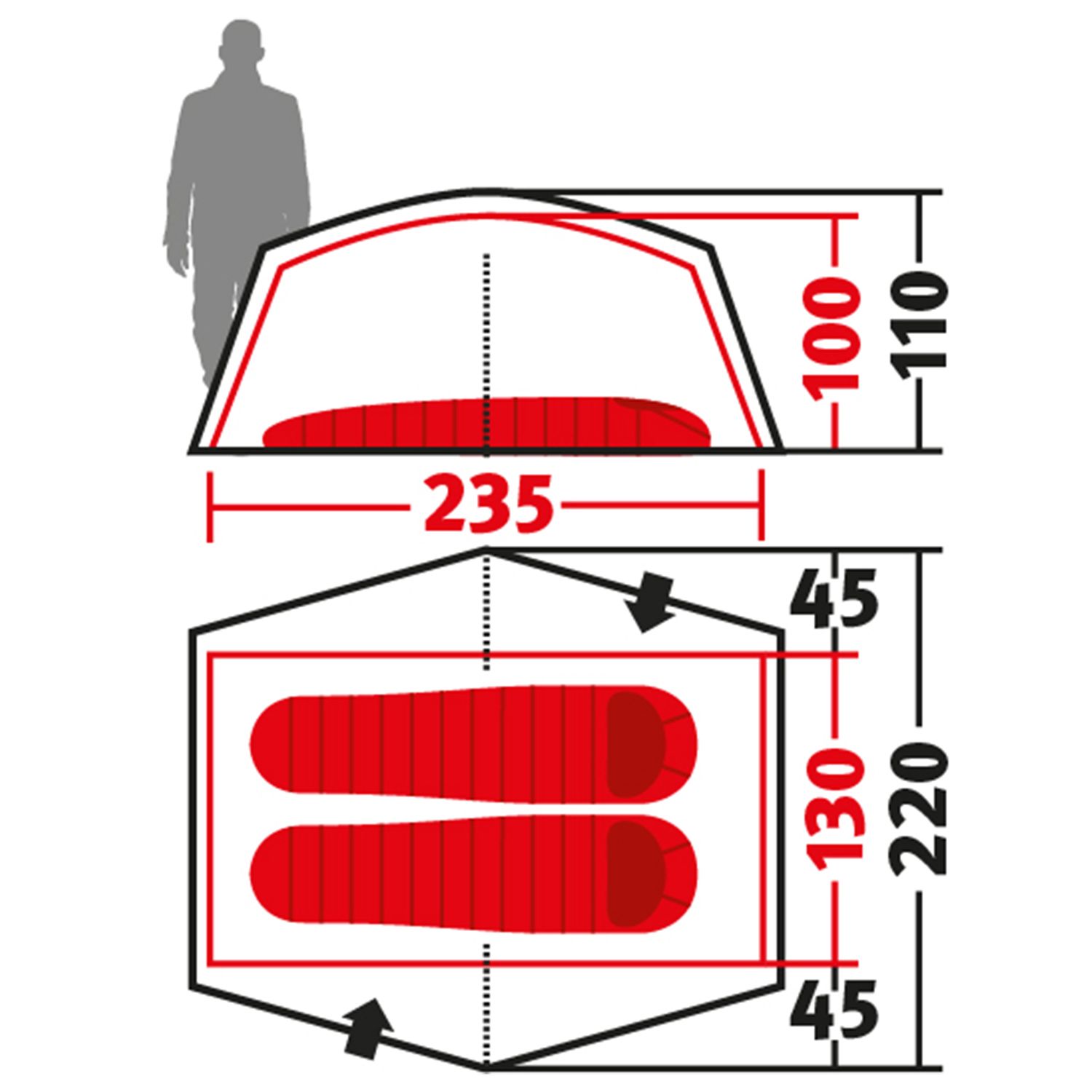 - Наружная палатка (Д х Ш х В): 225 х 235 х 100 см