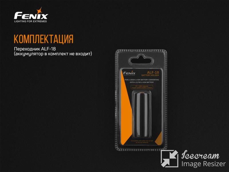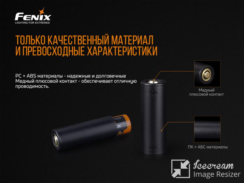 Переходник Fenix ALF-18 используется вместе с литий-ионным аккумулятором 18650. Этот тип батареи может применяться как литий-ионная батарея типа 21700, когда комбинируется с держателем. В основе изделия исключительно качественные материалы, а именно, АБС-пластик. Специфика материала состоит в том, что он ударопрочный и влагостойкий, при этом нетоксичный. Соответственно, модель получает такие качества, как прочность и износостойкость. Медный плюсовый контакт обеспечит хорошую проводимость тока.
