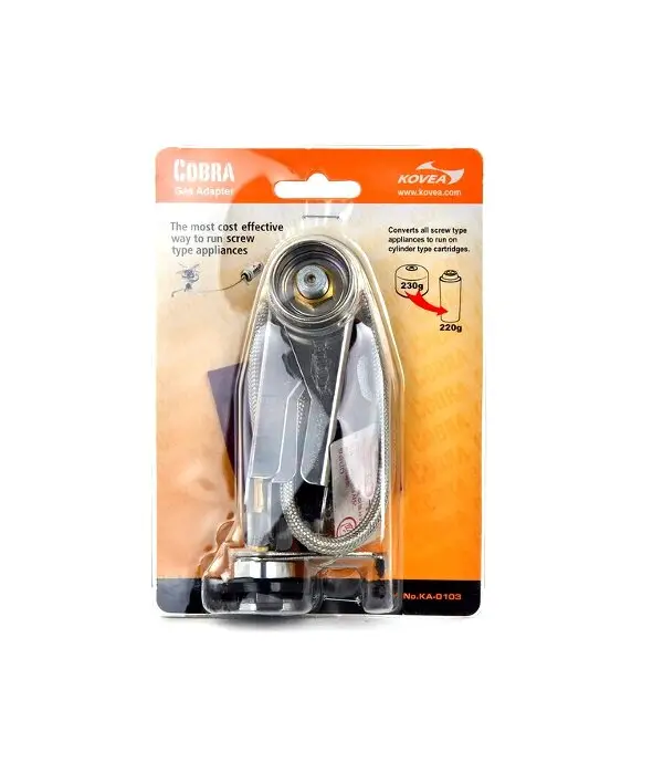 Специальный переходник со шлангом и своей складной подставкой Kovea KA-0103 Cobra для горелок резьбового стандарта epi-gas на высокий цанговый газовый баллон KGF-0220. Используется для всех видов горелок Kovea с резьбовым подсоединением баллона. Основной очевидный бонус использования цангового баллона для горелок и ламп – дешевизна. Он стоит почти вдвое меньше резьбового баллона аналогичной емкости. Среди других преимуществ можно перечислить высокую стойкость, универсальность и функциональность таких конструкций. На невыносимую горелку, которая закреплена на баллоне, не удастся поставить большую емкость, поскольку есть шанс опрокинуть все это дело. Использование Kovea KA-0103 Cobra позволяет вам самостоятельно решать когда удобнее невыносимое или выносное решение. На такой переходник можно установить ряд невыносимых горелок и ламп Kovea, что позволяет тащить с собой только один вид баллонов, не заморачивая вопросы совместимости. Также, на невыносимые горелки лучше не ставить ветрозащиту, ввиду возможного перегрева баллона. С Kovea KA-0103 Cobra вы выносите баллон от горелки на достаточно большое расстояние, что позволяет полноценно пользоваться защитным экраном.