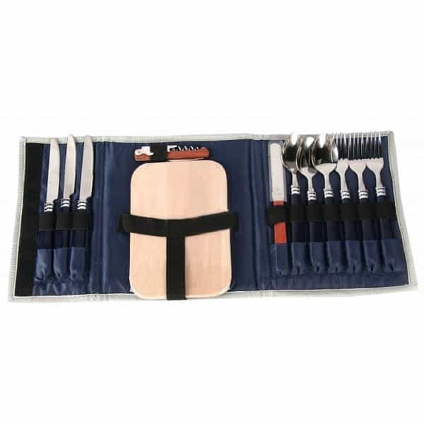 Металлические походные кружки закреплены ремнями. Ножи, вилки, ложки хранятся в карманах. Салфетки продеты под специальные ручки. Предметы не падают, не болтаются по сумке. Сумка для набора компактная, умещается в автомобиле, на багажнике мопеда. Изделие имеет удобную ручку для ношения на плече.
