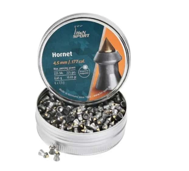 Пули для пневматики H&N Hornet (4.5мм, 0.65г, 225шт) – идеальный вариант для средних дистанций. Они отличаются высокой пробивной способностью, улучшенным дизайном и хорошей экспансивностью. Рекомендуемая дульная энергия в данном случае – от 7,5 Дж. Максимальное расстояние для стрельбы – 30 метров.