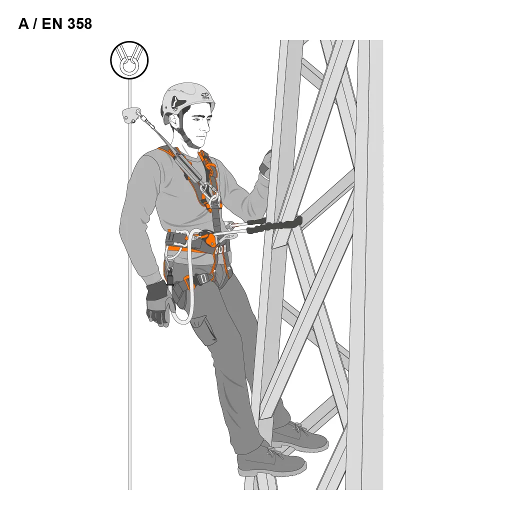 Регулируемая самостраховка Climbing Technology Finch Plus может быть соединена с боковыми точками крепления (EN 358) комбинированной страховочной системы, для подъема вверх или для позиционирования на опорах, а также может быть прикреплена к центральной точке крепления (EN 813) для размещения на наклонных поверхностях, где нет риска маятника.