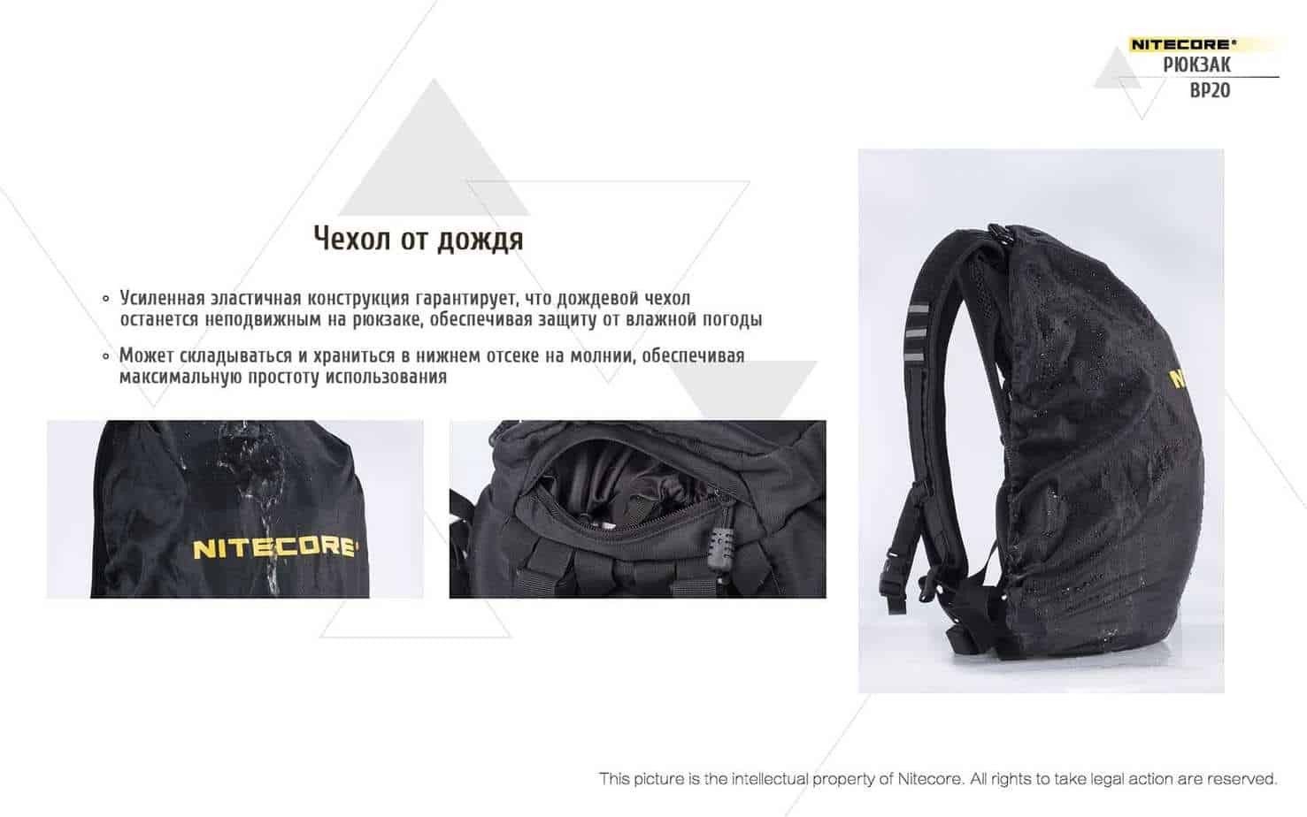 Комплект самого рюкзака предполагает включается специальный чехол с идеальной влагозащитой, для условий с увеличенной влажностью. Чехол наделен усиленной эластичной конструкцией обеспечивающей, превосходное фиксирование при ходьбе или беге, но и при условии сильного ветра, и тем самым оставаясь на месте и при этом гарантируя улучшенную защиту от проникновения влаги. Уникально для данного чехла имеется в распоряжении и отдельный скрытый карман на небольшой молнии с бегунком, для уменьшения места в самом рюкзаке и для того, чтобы по случаю вытянуть чехол и закрыть им рюкзак Nitecore BP20 от дождя.