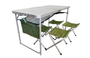 застолий и станет просто незаменим при выезде на природу. В наборе со столом укомплектовано 4 алюминиевых стульчика. Раскладные стулья складываются и легко транспортируются за счет своего малого веса- 0.6 кг.