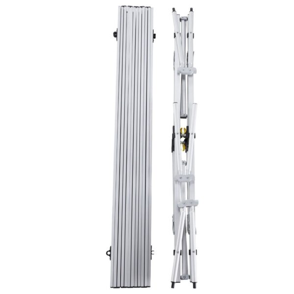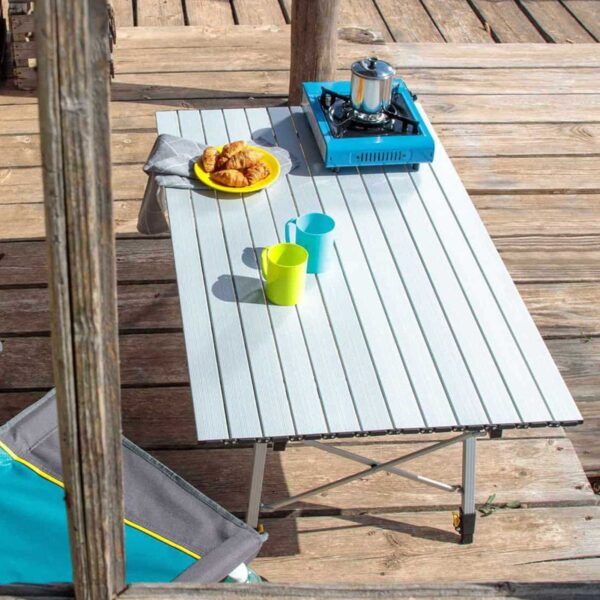Столешница имеет достаточные размеры, чтобы за столом комфортно разместились 6 человек. В сложенном виде стол компактно размещается в чехле. Алюминиевая поверхность столешницы легко чистится и является максимально гигиенической, поскольку алюминий не формирует среду для размножения микробов.