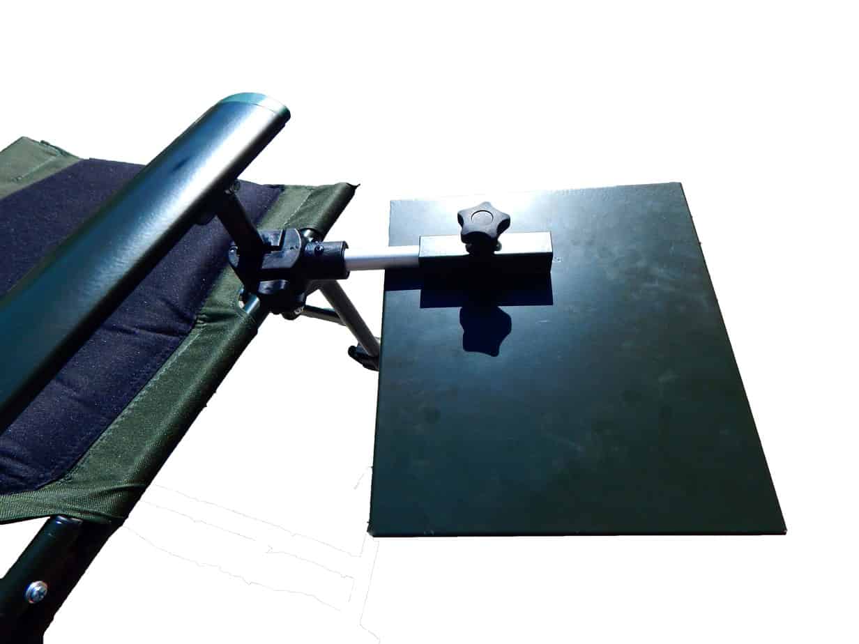 Универсальный алюминиевый столик к платформе или кресла подходит под ногу диаметром 19-22-25мм. Вы можете располагать на нем приманки, монтаже, аксессуары, продукты и напитки.
