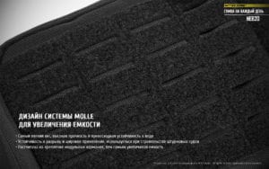 Основой конструкции сумки Nitecore NEB20 является надежный по своим физическим свойствам нейлон с плотностью нити 1050 ден — это материал Cordura 1050D. Данный материал обладает превосходной плотностью конструкции, такие технологии обеспечат отличную устойчивость к разрывам и износу. За счет уникального покрытия наносящегося на верхний слой материала, защищает внутреннюю часть от намокания, то есть препятствует проникновение воды и влаги, также огромной особенностью покрытия является, то что оно противостоит загрязнению. За счет высокой прочности и достаточно легкой конструкции, сумку можно использовать при любых погодных условиях, как в сильный дождь так и солнечную погоду. Особенность ткани Cordura 1050D устойчива к разрыву и имеет широкое применение, в том числе и использование при строительстве штурмовых судов.