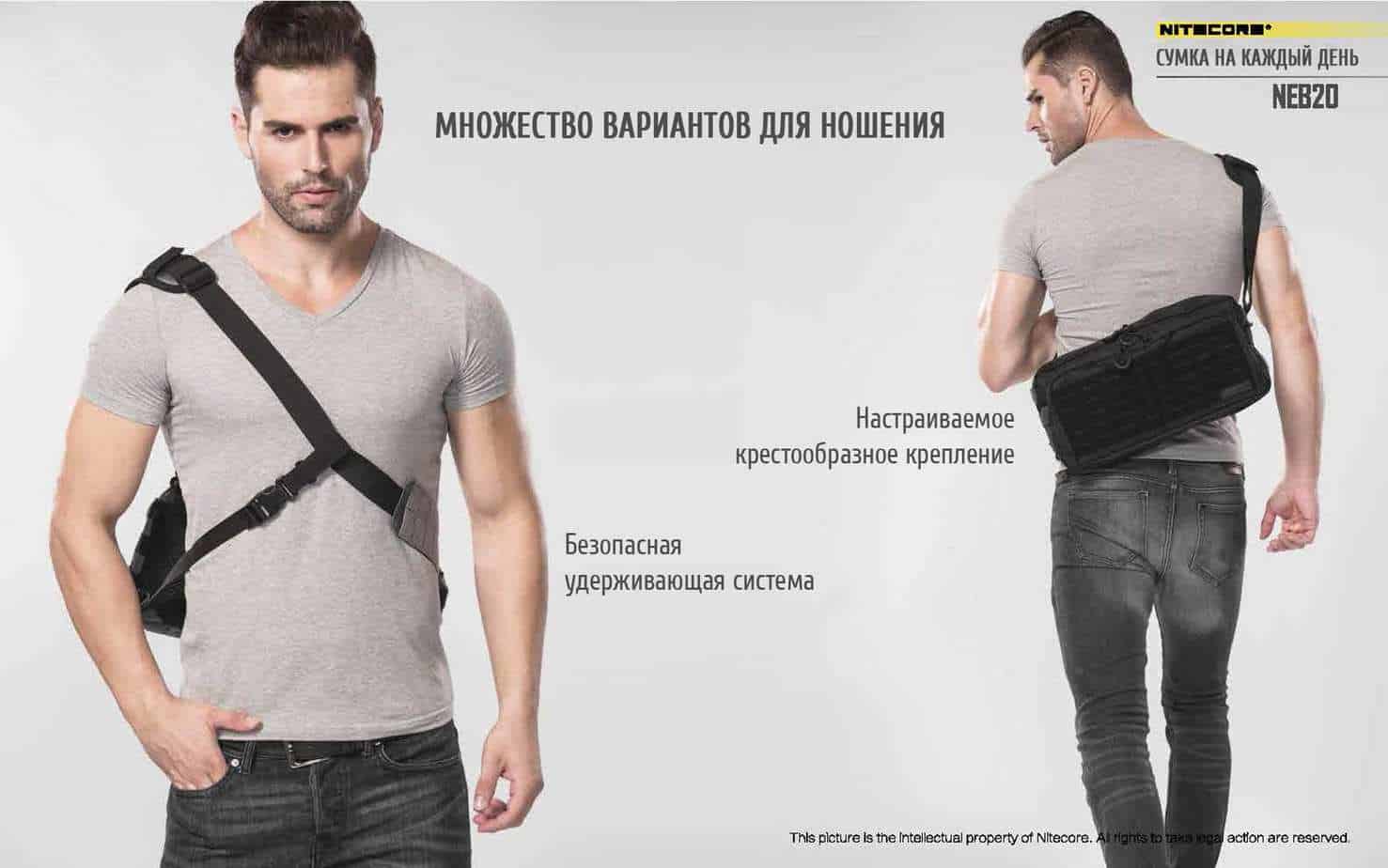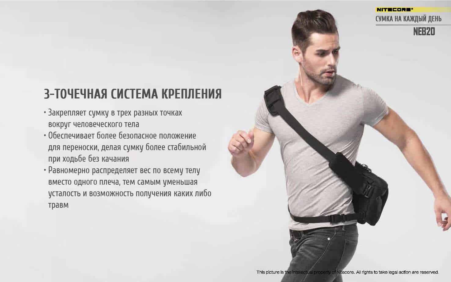 Для того чтобы увеличить практичность на время ношения и применять данную сумку в роли туристической, компания Nitecore употребляет эргономичную и очень достаточно практичную систему фиксирования с помощью трех точек, за счет использования такой системы крепления, закрепление NEB20 намного упрощается, что делает её намного практичней в транспортировании. Модифицированная система крепления подразумевает идентичное фиксирование с обоих сторон человеческого тела, что позволит применять ее без трудности как правшам так и левшам. За счет трех точечной системы фиксирования Nitecore NEB20, масса транспортируемого на плече снаряжения или вещей равномерно разделится по всему телу вместо того, если сравнивать с обычной плечевой сумкой, за счет такого распределения массы переносимого снаряжения, убавится усталость и шанс получения травм в дальнейшем.
