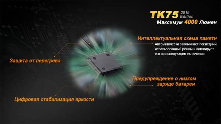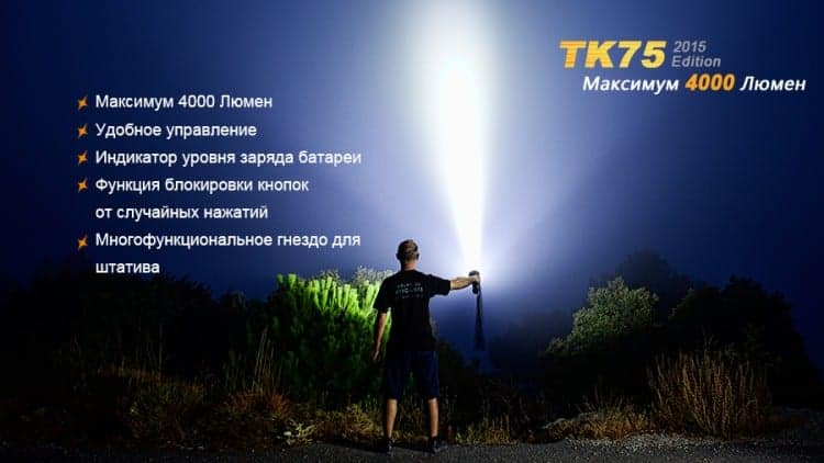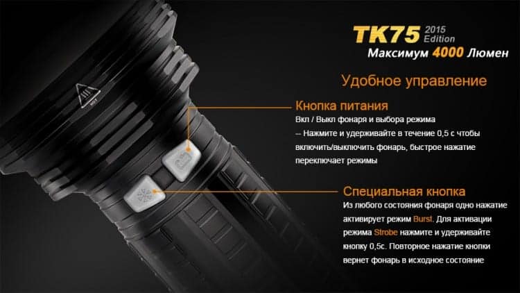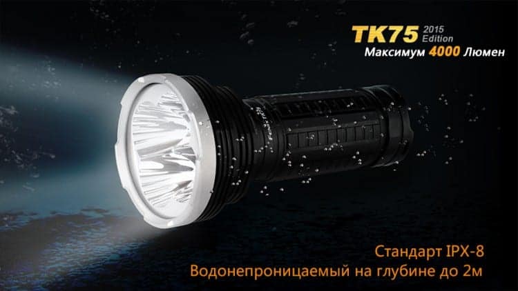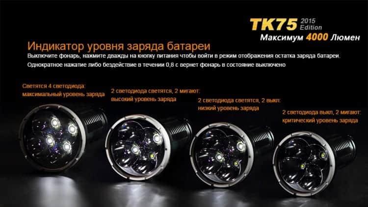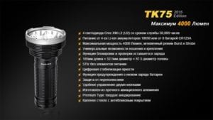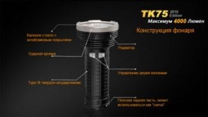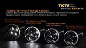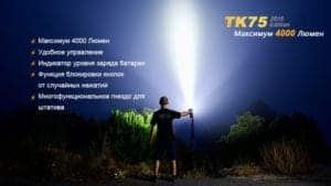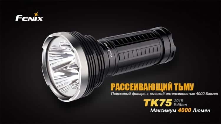 Модель Fenix TK75 (2015) использует в качестве источника света четыре светодиода Cree XM-L2 (U2). Они выбраны за отличные показатели долговечности и яркости. Совместно, четыре диода дают до 4000 люмен света. А ресурс использования каждого из этих диодов составляет не менее 50 000 ч. Фонарь работает в шести режимах, из которых четыре отведены на уровни яркости, а еще два обеспечивают мгновенный доступ к постоянному и мигающему свету.