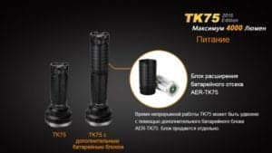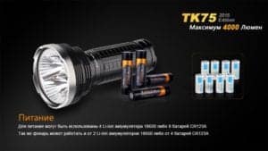Fenix TK75 (2015) использует для питания аккумуляторы стандарта 18650 или батарейки без возможности перезарядки типа CR123A. В один комплект должно входить 4 аккумулятора либо 8 батареек. Правда, фонарь может работать и с половиной необходимого количества элементов питания. При этом, все режимы освещения будут работать штатно, но уменьшится время освещения в каждом из них.