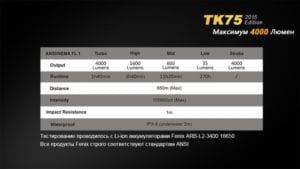 Гарантия: Компания Fenix предоставляет покупателям пять лет гарантии на каждый фонарь модели Fenix TK75 (2015).