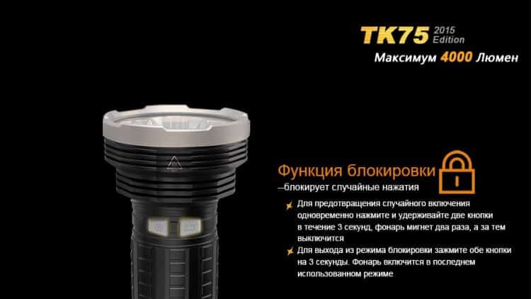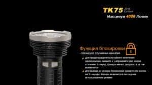 Внимания заслуживает функция блокировки включения фонаря. Если нажать одновременно обе его кнопки и держать из 3 с, фонарь будет заблокирован и не включится случайно в рюкзаке или багажнике машины. Повторное такое же нажатие разблокирует Fenix TK75 (2015).