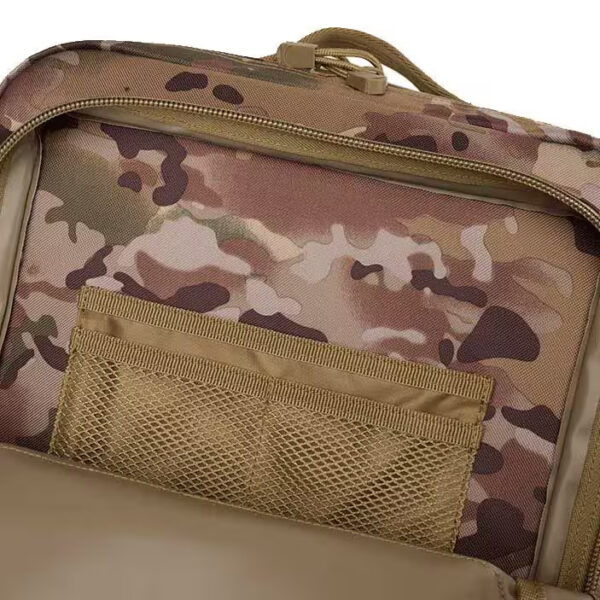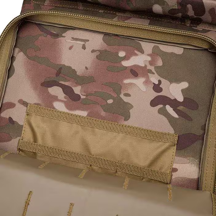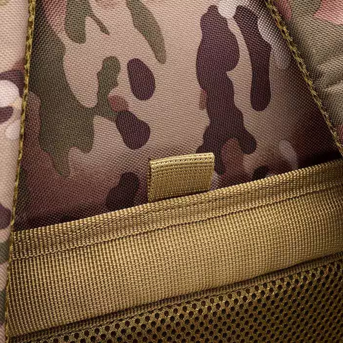 Спереди и по бокам рюкзака вшиты стропы PALS, позволяющие крепить снаряжение по системе MOLLE. Оснащен компрессионными ремнями, которые также могут быть использованы для фиксации дополнительного снаряжения, например спального мешка или каремата.