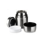 Благодаря двойным стенкам с минимальной теплопроводностью термос способен сохранять температуру пищи до 12 часов. Пробка выкручивается. В комплекте имеется пластиковая миска, которая прячется в крышку.