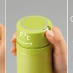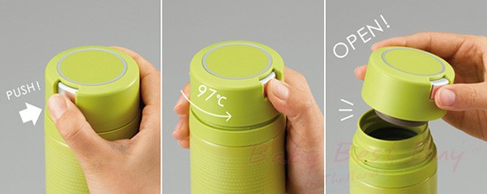 Нажмите и удерживайте кнопку, затем поверните крышку всего на 97 градусов и она откроется! Теперь не нужно долго отвинчивать крышку делая по несколько оборотов. Буквально четверть оборота и крышка открыта! Что-бы избежать самопроизвольного отвинчивания крышка надежно фиксируется кнопкой.
