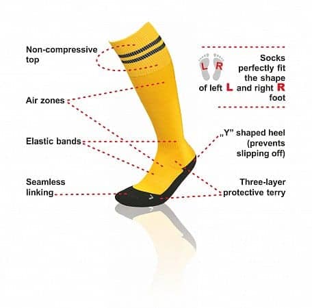 Профилированные махровые участки носков поглощают удары и защищают чувствительные зоны ног и лодыжек против ссадин и травм. В этих носках ноги всегда сухие. В случае промокания носков процесс высыхания намного короче, чем в хлопчатобумажных носках, что важно при использовании в экстремальных условиях. Носки имеют анатомическую форму: левый (L) и правый (R). Благодаря содержанию ионов серебра в волокне носки выступают в качестве дезодоранта. Это предотвращает образование запаха и обеспечивает максимальную гигиеничность.