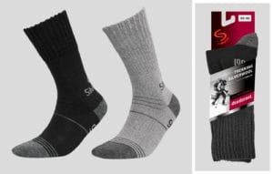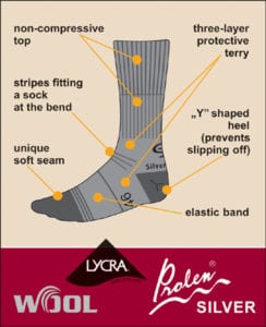 Мягкие профилированные махровые участки треккинговых носков поглощают удары и защищают чувствительные зоны ног и лодыжек от ссадин и травм. Уникальные свойства натуральной мериносовой шерсти обеспечивают поддержание тепла и поглощение избыточной влаги, поэтому ноги всегда сухие. В случае промокания носков процесс высыхания намного короче, чем в хлопчатобумажных носках, что важно при использовании в экстремальных условиях. Носки имеют анатомическую форму: левый (L) и правый (R). Благодаря содержанию ионов серебра в волокне носки выступают в качестве дезодоранта. Это предотвращает образование запаха и обеспечивает максимальную гигиеничность.