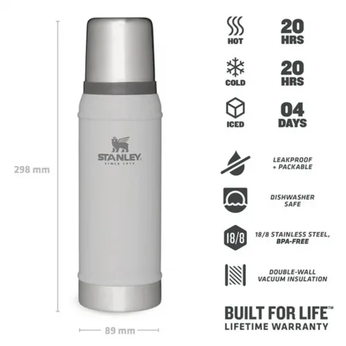 Также термос отлично дополнит любой набор  туристического снаряжения , при этом его можно будет удобно транспортировать так, как он не занимает много места. За счет оптимального диаметра, термос Stanley Legendary Classic 0,75л можно легко помещать в боковой карман туристического или городского рюкзака. Следует отметить и невероятный показатель времени сохранения температуры, составляющий до 20 часов как горячих, так и холодных напитков.