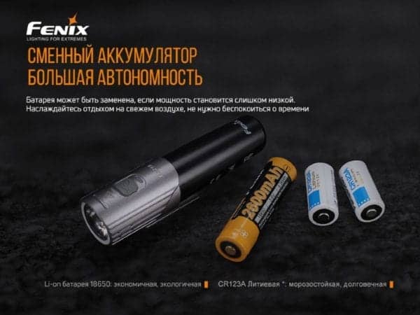 | Элементы питания | 2CR123A, 18650 x 1 |