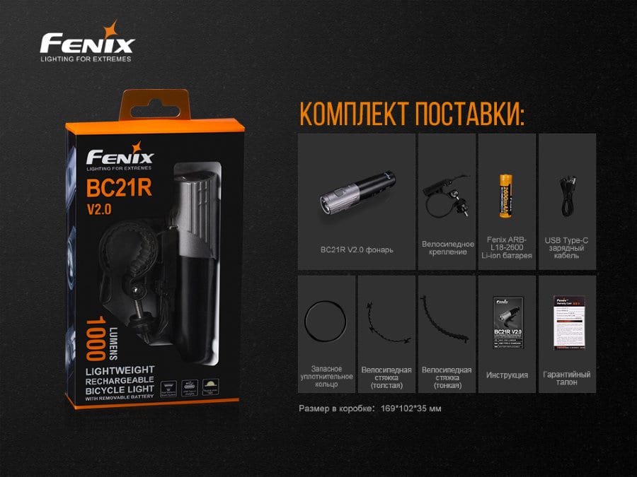 | Комплектация | Фонарь, крепление на велосипед, батарейка Fenix ARB-L18-2600 18650, кабель USB Type C, уплотнительное кольцо, монтажные прокладки, инструкция, гарантийный талон | ||||||