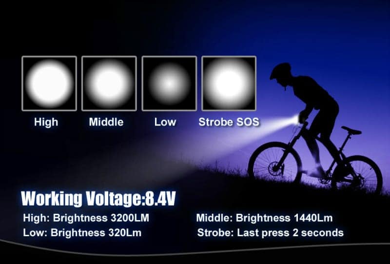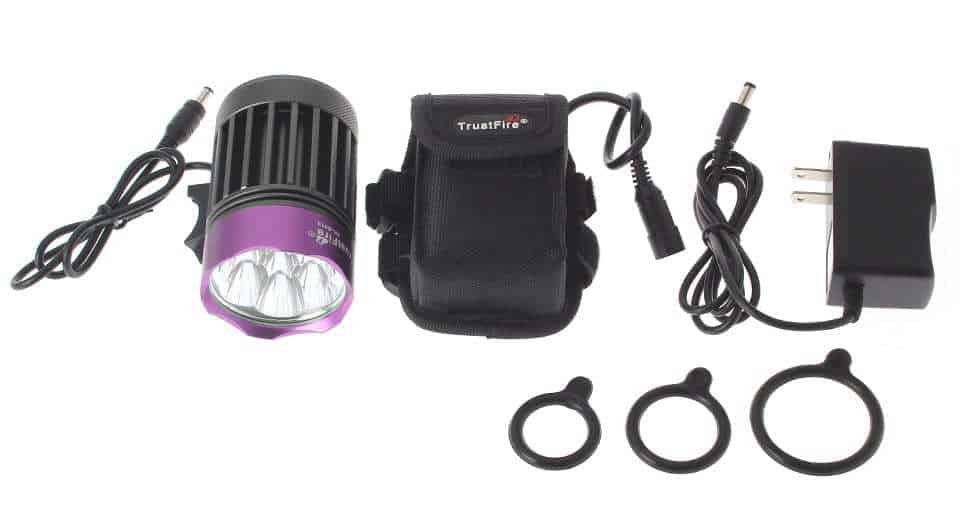 TrustFire TR-D014 оснащена 7 светодиодами CREE XM-L2, которые выдают световой поток 3200 люмен. Так же можно использоваь этот фонарь в качестве кемпингового. Достаточно открутить нижнее крепление на руль и установить фару на штатив. На руль велофара быстро крепится при помощи одного резинового кольца, что позволяет так же быстро ее снять. В комплекте идут 3 резиновых кольца диаметром 35мм, 40мм, 50мм.