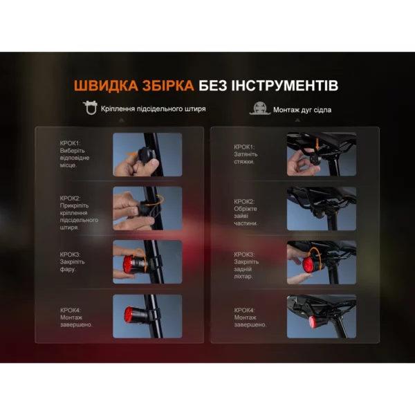 - задняя велофара для крепления к дугам седла или к подседельному штырю;