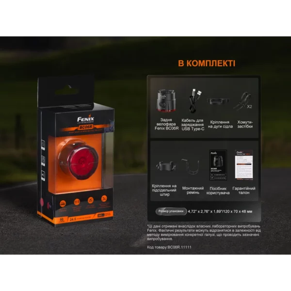 Велофара Fenix BC06R, зарядный кабель USB Type-C, крепление к дугам седла и подседельного штыря, монтажный ремень, стяжки, инструкция пользователя, гарантийный талон.