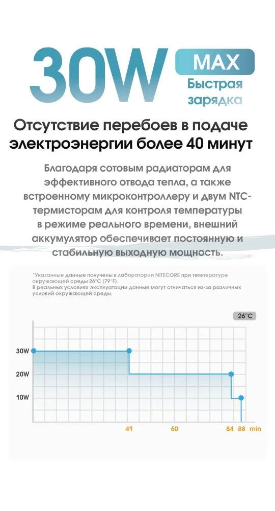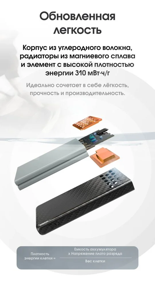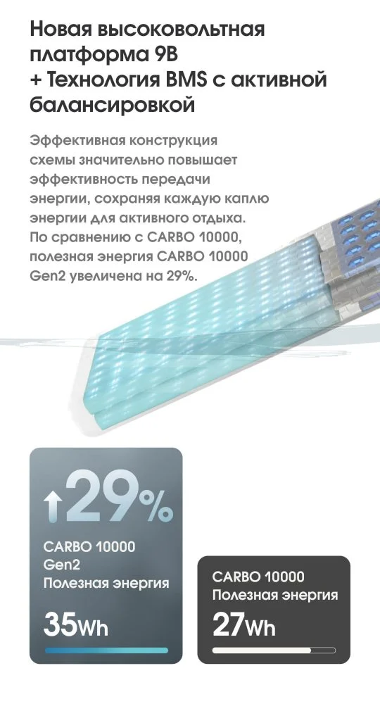 Новая высоковольтная платформа 9В с технологией активного балансирования BMS значительно улучшает эффективность передачи энергии. В сравнении с предыдущей моделью, эффективность увеличена на 29% и составляет 35Вт/ч. Power bank гарантирует стабильное питание без снижения мощности более 40 минут благодаря теплопоглощающим радиаторам типа «соты», встроенному MCU и двум термисторам NTC для мониторинга температуры в реальном времени. Это обеспечивает надежную и устойчивую подачу полной мощности на подключенные устройства.