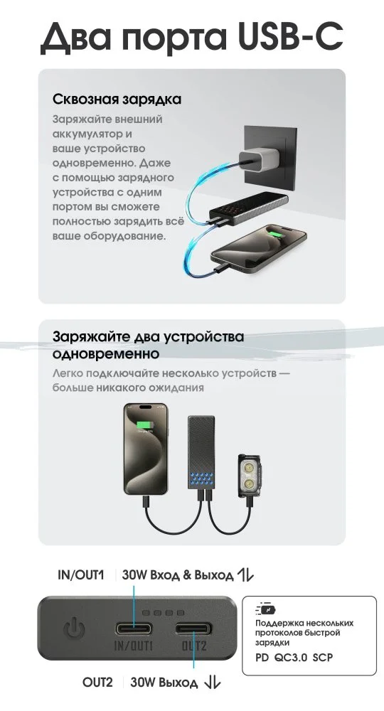 Встроенные два USB-C порта позволяют не только заряжать одновременно два устройства, но и осуществлять сквозную зарядку подключенных гаджетов, что делает использование устройства максимально удобным. Nitecore CARBO 10000 GEN2 отлично подходит для трекинга, скалолазания, походов и любых активностей на свежем воздухе, где требуется надежный и мощный источник энергии.