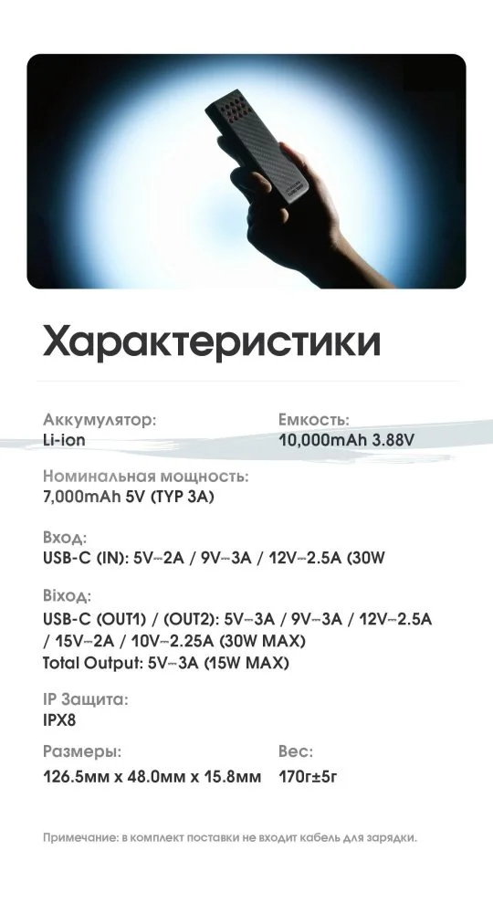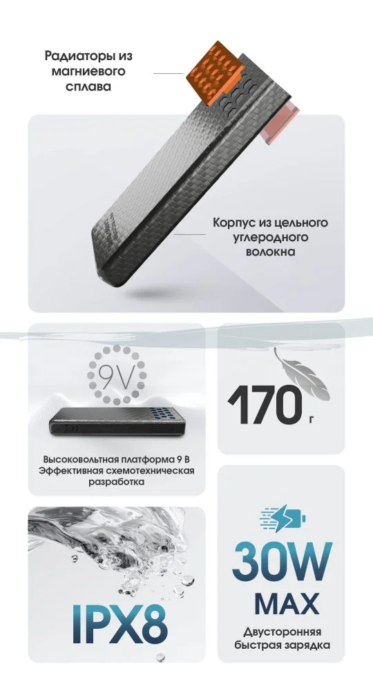 Защита корпуса по стандарту IPX8 позволяет погружать power bank под воду на глубину до 2-х метров без риска повреждения. Это особенно важно для активного отдыха, походов в условиях повышенной влажности или неожиданных дождей.