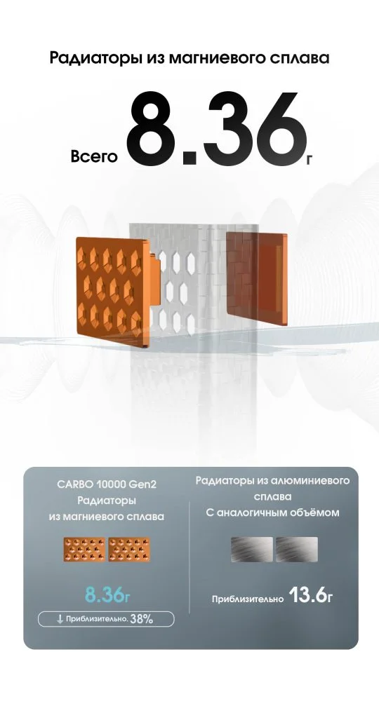 Одним из ключевых преимуществ модели является использование радиаторов из магниевого сплава для оптимального рассеивания тепла. Такие радиаторы легче алюминиевых и при этом эффективно снижают температуру корпуса при интенсивной работе. Вес корпуса всего 12,5 грамм, а общий вес устройства составляет 170 грамм, что делает Nitecore CARBO 10000 GEN2 невероятно удобным для переноски даже в компактном рюкзаке.
