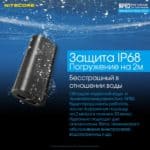 Благодаря наличию водонепроницаемости по международному стандарту защиты IP 68, Nitecore NPB2 обладает невероятной защитой комплектующих от влажной окружающей среды. Класс защиты IP 68 гарантированно обеспечивает водонепроницаемость под водой на глубине до 2 м, с сохранением полной работоспособности устройства на протяжении 30 минут.