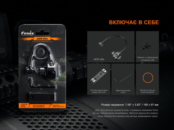 Помимо Fenix AER-06S в базовую комплектацию включена планка MIL-STD-1913 в качестве основания, а также планка M-LOK в качестве дополнительного аксессуара в наборе. Модель имеет класс влагозащиты IPX6, что не дает мельчайшим каплям воды повлиять на работоспособность переключателя. В набор входит дополнительное уплотнительное кольцо на случай износа первого, уже установленного в аксессуар.