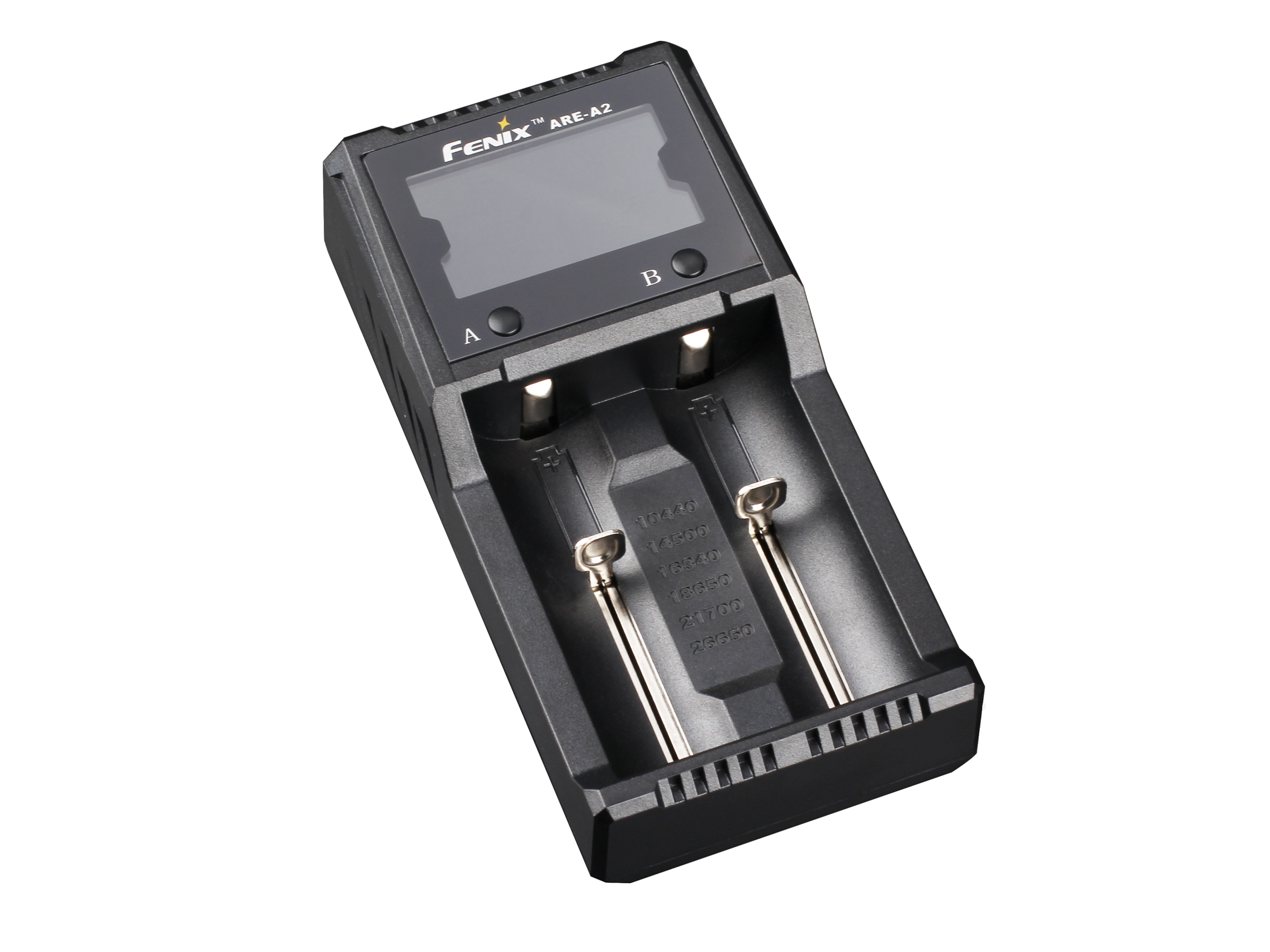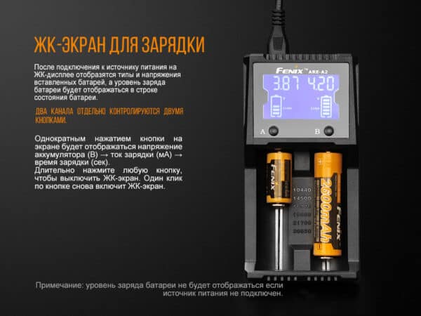 Fenix ARE-A2 работает с элементами питания с литий-ионным электролитом (форматы 18650, 14500, 21700, 10440, 16340, 26650), никель-металлгидридным и никель-кадмиевым (форматы АА,. Одновременно можно заряжать сразу два аккумулятора, которые устанавливаются в полностью независимые ячейки. В одно и то же время пользователь может заряжать пару совершенно одинаковых элементов питания или разные аккумуляторы. В любом случае, устройство самостоятельно продиагностирует их и выберет наилучший режим для зарядки. Пользователь может следить за процессом с помощью встроенного дисплея. Информация на нем также отображается отдельно для каждого канала, а переключать режимы отображения можно с помощью двух кнопок в нижней части экрана. Пользователю виден текущий статус, тип аккумулятора, его вольтаж, время полной зарядки. Если пользователь хочет выключить дисплей, достаточно один раз нажать кнопку и немного подержать, прежде чем отпустить. Еще одно короткое нажатие снова включил экран.