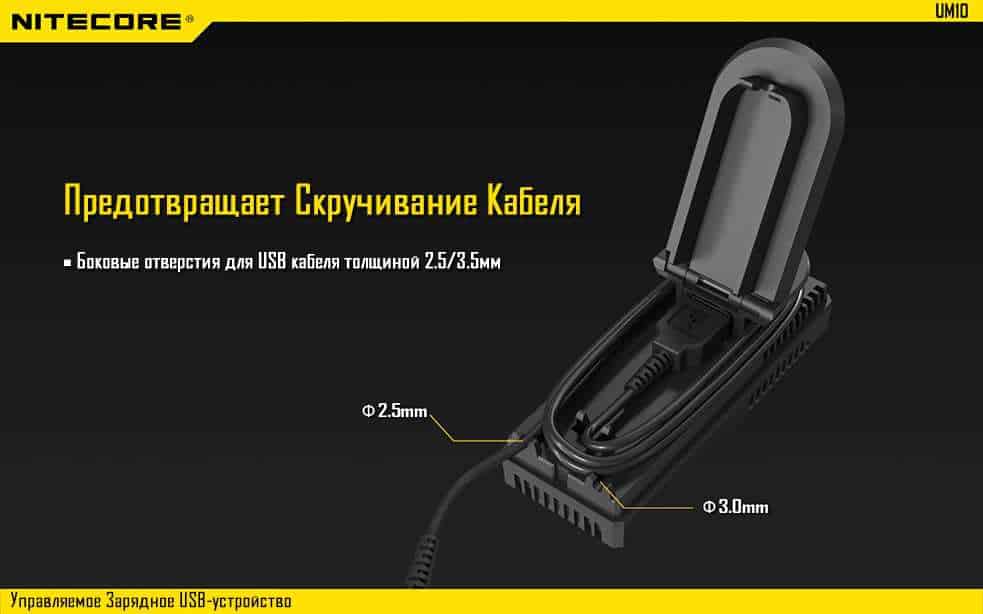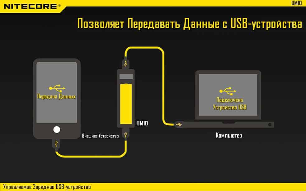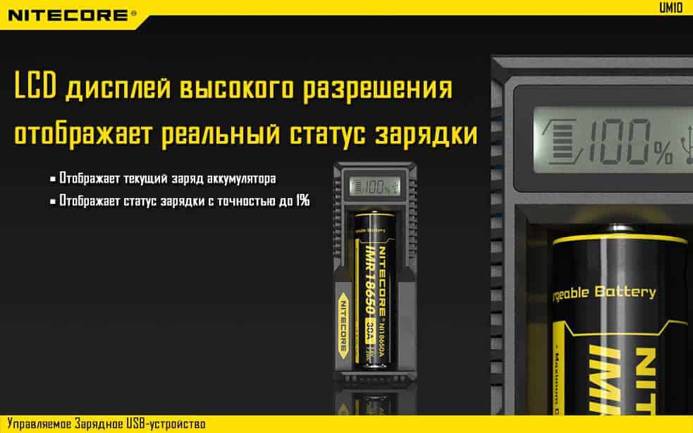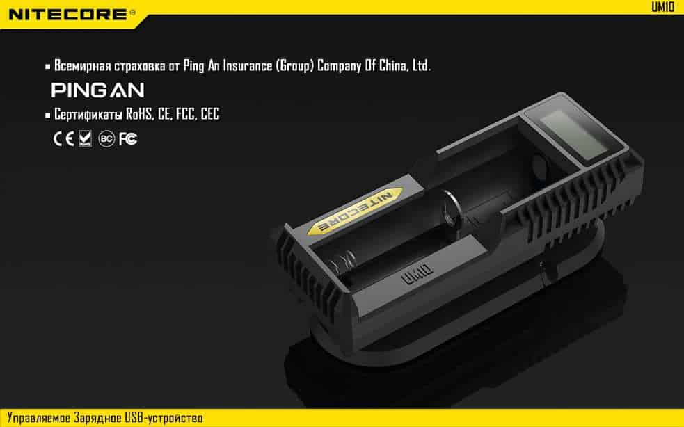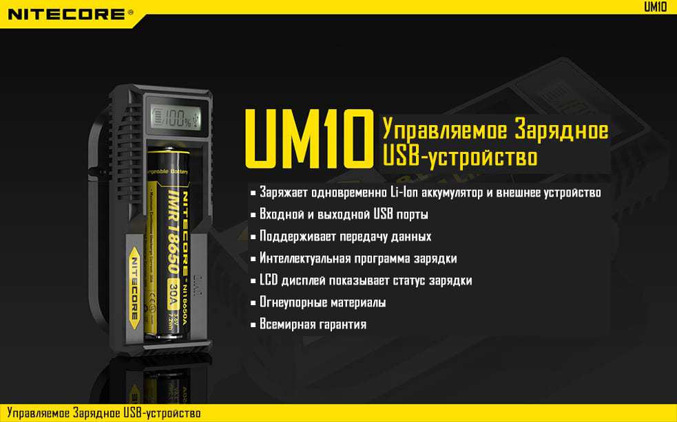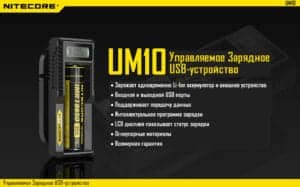Управляемое зарядное устройство UM10 производства известной компании Nitecore.  Представленная зарядка имеет современный дизайн, который придется по душе любителям минималистичного дизайна. Данное зарядное устройство разрабатывалось специально для того чтобы производить одновременную зарядку как установленного элемента питания так и подключенного внешнего устройства. Оснащено входным и выходным USB портами. Также для устройства предусмотрена передача данных с внешнего устройства на более ёмкий носитель, например, портативный компьютер, ноутбук и т.д..
