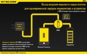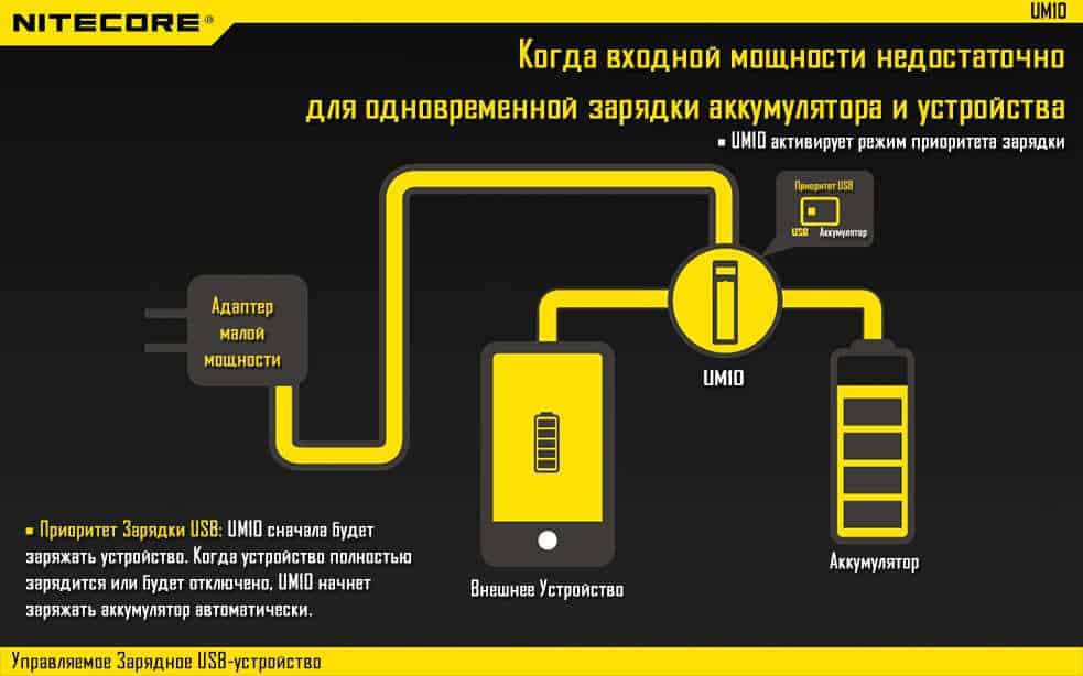 При достаточно мощном входящем напряжении и при подключенным к ней как аккумулятора так и внешнего устройства, зарядное устройство будет заряжать их одновременно. Также при недостаточном входном напряжении подающегося на UM10, Вы сможете выбрать приоритет зарядки, при котором будет осуществляться зарядка USB устройства или аккумулятора, но за счет интеллектуального микропроцессора, после зарядки к примеру USB устройства, зарядка автоматически переключиться на заряжание аккумулятора, все тоже произойдет при первоначальной зарядке аккумулятора.