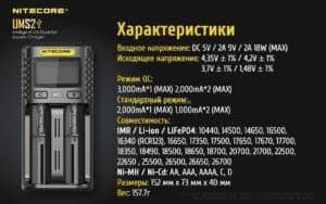 Продолжением хорошо знакомой серии интеллектуальных устройств от компании Nitecore, является устройство – UMS2. Модель зарядки обладает самым высоким значением исходящего тока, подающегося на аккумуляторы и составляет целых 4А. Помимо представленного качества зарядное устройство отличается своими инновационными введениями, основывающиеся на различных процессах проверки элемента питания, его зарядки и главное самой высокой степени безопасности.