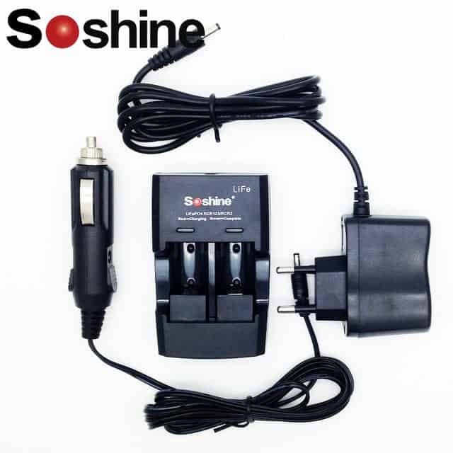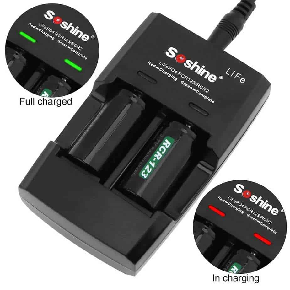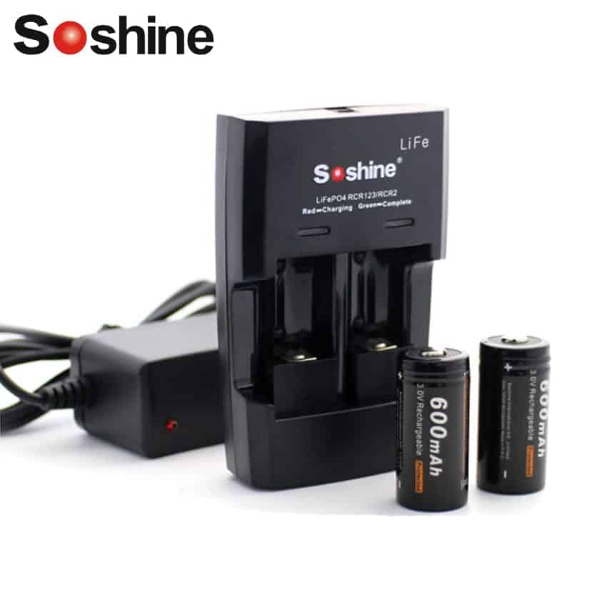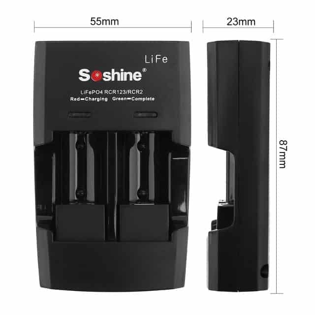 Интеллектуальное зарядное устройство Soshine S5-Fe. Представленное зарядное устройство рассчитано на зарядку литиевых-железо-фосфатных аккумуляторов (LifePo4) типоразмеров RCR123/RCR2/16340/16340P/17335/14250/15266 напряжением 3,0 В. Зарядное устройство имеет индикацию заряда аккумулятора, где отражается состояние на данном этапе зарядки аккумуляторов. При полностью заряженном элементе питания — индикатор горит зеленым цветом, при разряженном — красным. Также обладает двумя независимыми каналами, что дает заряжать одновременно разные виды аккумуляторов не боясь их испортить.
